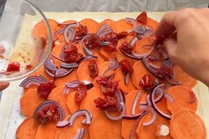 12. Besprenkel met een beetje olijfolie en bak de plaattaart met zoete aardappel ca. 20 à 25 min in de oven tot deze gaar is.