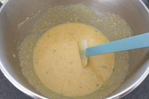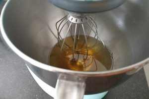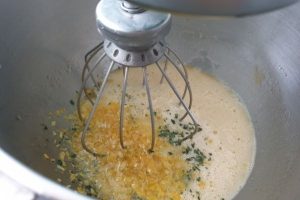 6. Mix de olijfolie met 150 gram honing. Zodra dit gemixt is, voeg je de eieren, tijm en de citroenrasp toe.