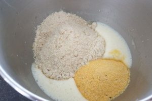 7. Zet de mixer uit en schep het amandelmeel, de polenta en 50 ml citroensap erdoorheen.