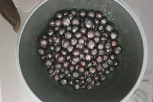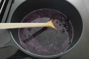 9. Maak ondertussen de blauwe bessen saus. Voeg de blauwe bessen toe aan een steelpan met dikke bodem samen met de honing en 400 ml water. Breng aan de kook.