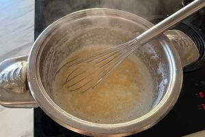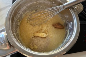 6. Roer, zodra de polenta gaar is, de misopasta, edelgistvlokken en plantaardige boter door de polenta. Meng goed met een garde of houten lepel tot alles mooi is opgenomen en de polenta extra romig is.