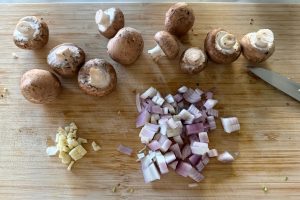 2. Zet het vuur laag en laat de polenta 10-15 minuten zachtjes pruttelen, terwijl je regelmatig blijft roeren. Snijd ondertussen de champignons in plakjes, hak de knoflook fijn en versnipper de ui. De polenta is klaar wanneer hij dik en romig is en het vocht volledig is opgenomen.