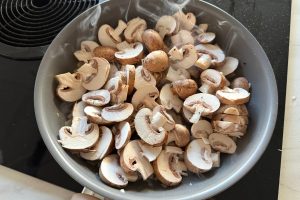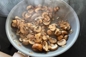 4. Voeg vervolgens de plakjes champignons toe en bak ze 4-5 minuten mee, tot het vocht is verdampt en de champignons goudbruin beginnen te kleuren.