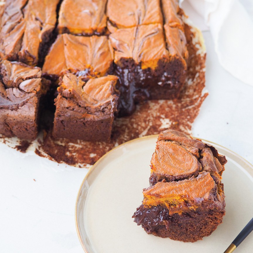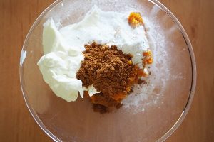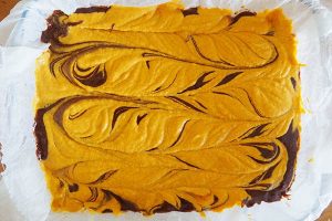 5. Doe in een andere kom de pompoenpuree met de roomkaas, poedersuiker en pumpkin spice kruiden. Meng dit tot een glad geheel. Verdeel met een lepel het pompoenmengsel over de brownie heen en ga er met een mes doorheen om een ‘swirl’ effect te krijgen.