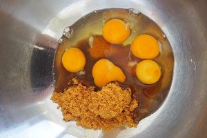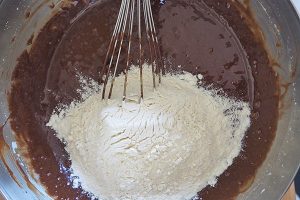 4. Klop ondertussen de eieren samen met de basterdsuiker luchtig. Voeg vervolgens de gesmolten chocolade hieraan toe en meng dit door elkaar met een garde. Zeef het zelfrijzend bakmeel boven de kom en spatel dit er doorheen totdat je een geheel krijgt. Giet het beslag in de bakvorm.