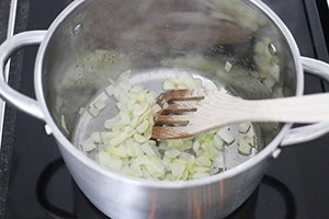 1. Snipper de ui en fruit deze aan in een grote (soep)pan met een beetje olie of margarine. Voeg de pompoenblokjes toe. Schep de currypasta er door en een klein scheutje water. Snijd de tomaten in blokjes en voeg samen met hun zaadjes en vocht toe aan de pan. Giet de kokosmelk er bij en roer door. Laat 10 minuten pruttelen.