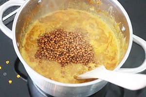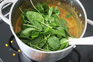 2. Giet de linzen af en schep ook door de curry. Voeg na 2 minuten de spinazie toe en als deze geslonken is dan is de pompoencurry klaar. Serveer met wat cashewnoten erover.