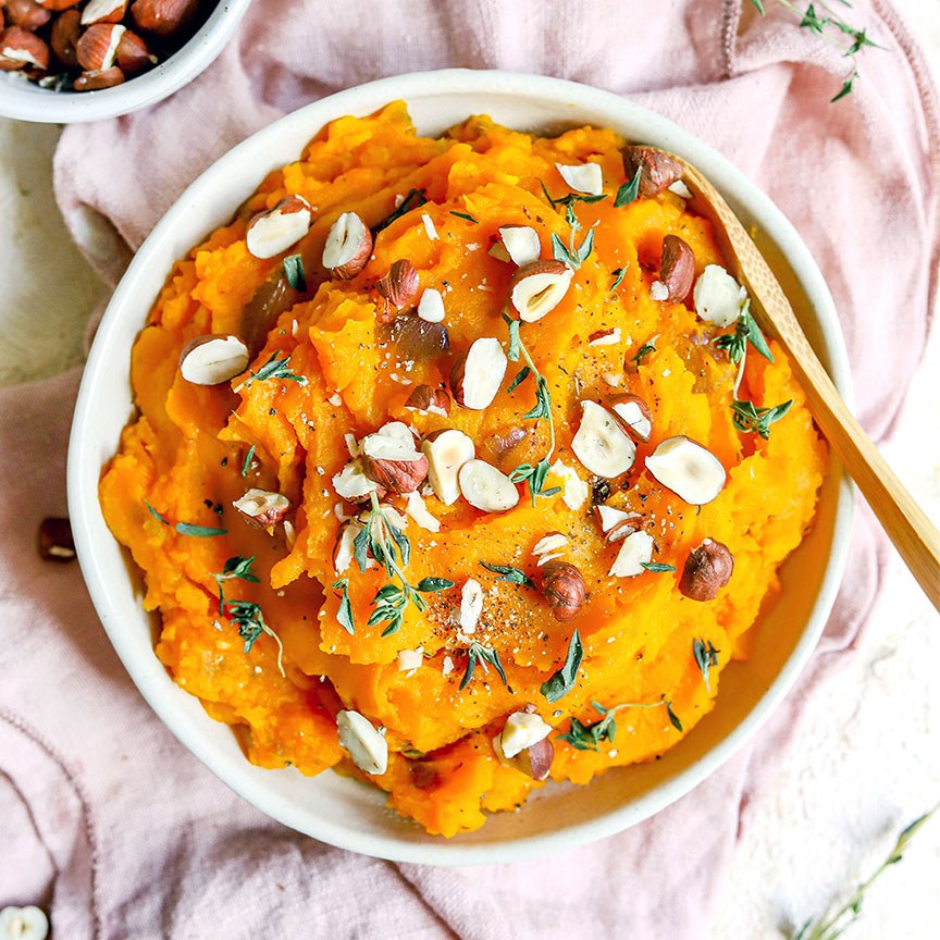 9. Bij de 2 overgebleven takjes tijm rits je de blaadjes er vanaf en hier top je de pompoenpuree mee af. Lekker om te serveren met geroosterde hazelnoten of gekaramaliseerde ui.