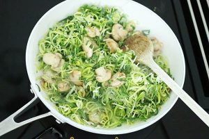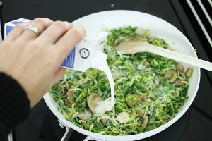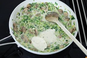 1. Roerbak de prei in een pan. Voeg de champignons toe en bak een paar minuutjes mee. Voeg de room toe samen met de mosterd en kruidenroomkaas. Breng op smaak met een snufje peper en zout. Laat het mengsel iets indikken.