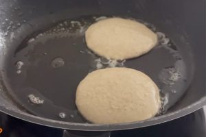 5. Schep ongeveer een sauslepel van het beslag in de pan. Je kunt er 3 of 4 in een pan maken. Bak ze goudbruin en draai ze dan voorzichtig om.