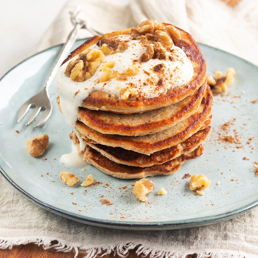 6. Serveer de pannenkoeken eventueel met wat extra Griekse yoghurt, noten en/of fruit.