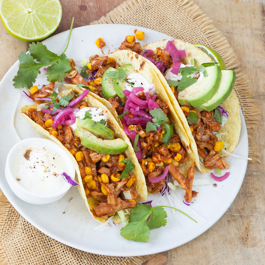 5. Verdeel daarna de avocado, mais, ingelegde ui en koriander over de taco’s jackfruit. Werk af met een lepel zure room en een kneepje limoen en serveer direct.