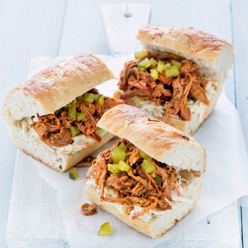 12. Voeg deze saus vervolgens beetje bij beetje toe aan de pulled pork tot je een smeuïge massa hebt. Serveer de pulled pork traditioneel op een broodje met de koolsalade en stukjes augurk.