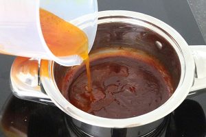 9. Meng ondertussen alle ingrediënten voor de barbecuesaus goed door elkaar met een lepeltje of kleine garde in een pannetje en verwarm deze. Zorg er voor dat de suiker helemaal is opgelost.