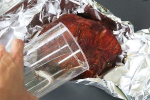15. Voeg tijdens het wikkelen in aluminiumfolie een klein scheutje appelsap toe en schenk dit over het vlees. Het vocht zorgt er voor dat het vlees extra sappig blijft en geeft meteen een lekkere smaak.