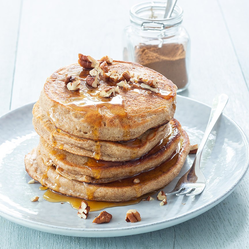 1. Zeef het bakmeel in een kom en voeg de karnemelk, suiker, eieren en pumpkin spice kruiden toe. Klop met een garde of mixer door elkaar. Verhit een pan en smelt hier wat boter of margarine in. Schep hoopjes van het beslag in de pan en bak 2 a 3 minuten aan een zijde, als er belletjes en gaatjes ontstaan dan kun je pannenkoeken omkeren Bak ook de andere zijde lichtbruin. Serveer de pumpkin spice pannenkoeken met wat grof gehakte pecannoten en honing of agavesiroop.