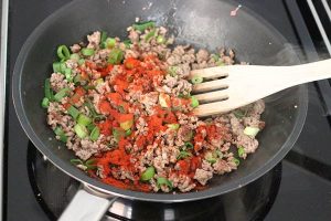 Doe er soms nog wat meer groentjes onder zoals champignons, erwtjes, paprika en ui. Eerst even mee bakken met het gehakt.