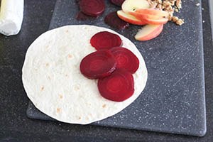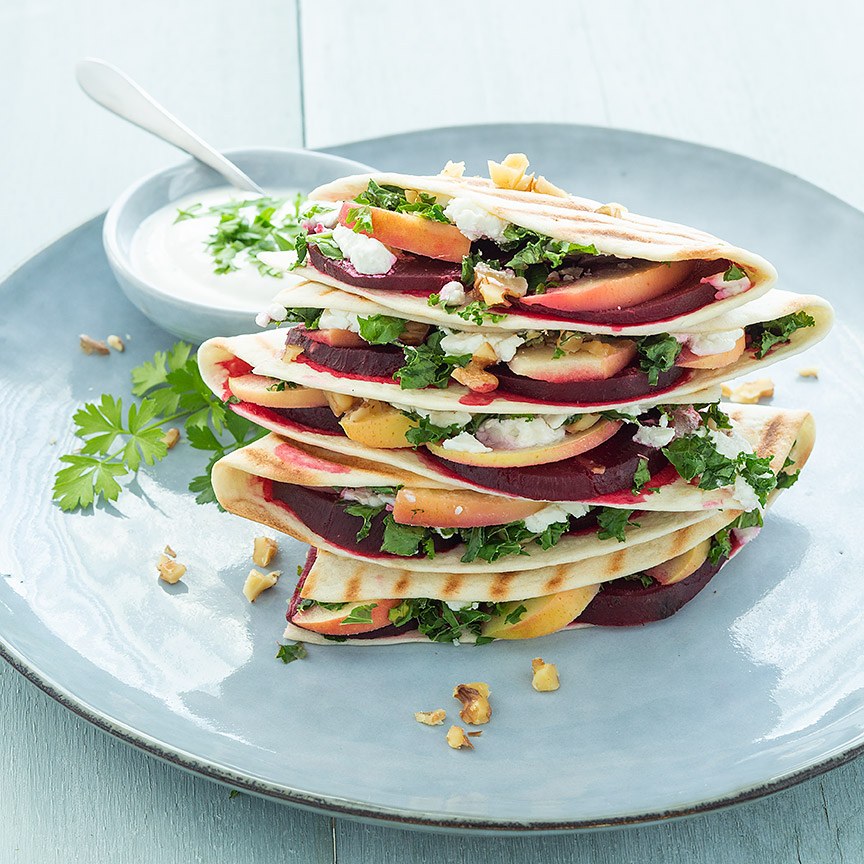 1. Indien je het tosti ijzer gebruikt, verwarm deze dan. Snijd de bieten en de appel in dunne plakjes. Hak de walnoten en peterselie fijn. Neem 1 tortilla en leg op de helft van de tortilla eerst plakjes biet, dan plakjes appel en vervolgens een deel van de gehakte walnoten. Verdeel vervolgens een beetje geitenkaas en boerenkool er overeen en vouw de tortilla dicht. Leg de quesadilla tussen het tosti ijzer en bak deze in ongeveer 3-5 minuten gaar.
