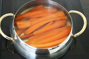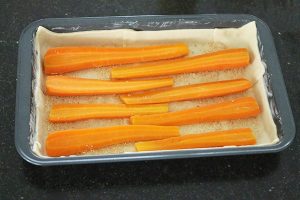 1. Verwarm de oven op 180 graden. Schrap de wortels zo nodig schoon. Halveer ze over de lengte en kook ze 5 minuten in een pan met water.