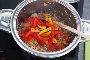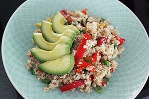 2. Kook ondertussen de quinoa in water met het opgeloste bouillonblokje. Snijd de geroosterde paprika in reepjes en schep met de bosui door de gekookte quinoa. Schep de quinoa op een bord en serveer met in plakken gesneden avocado, de krokante kip uit de oven, een flinke schep hüttenkäse en wat pijnboompitten.