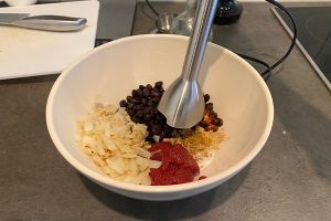 7. Gebruik een staafmixer om de ingrediënten te mixen. Het hoeft niet perfect glad te zijn, zo houd je namelijk wat structuur in de burger.