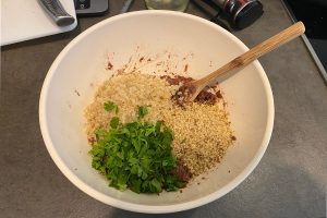 8. Voeg de verkruimelde walnoten, gekookte quinoa en de verse peterselie toe en mix alles goed door elkaar. Voeg, indien nodig, een eetlepel bloem of havermeel toe om de burgers nog wat steviger te maken.