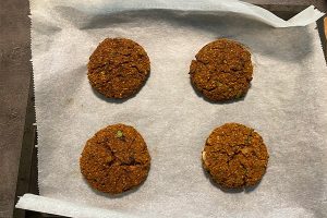 10. Zet de bakplaat in de oven en bak de burgers 30-35 minuten. Haal de bakplaat uit de oven en laat de burgers nog even afkoelen, zo voorkom je dat ze uit elkaar vallen.