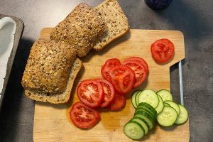11. Snijd in de tussentijd de broodjes open en snijd de tomaat, komkommer en avocado in plakjes.