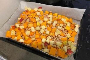 4. Verdeel de pompoen, appel en cannelini bonen over de bakplaat en besprenkel met olijfolie. Bestrooi met peper, zout en Italiaanse kruiden en mix het goed met je handen.
