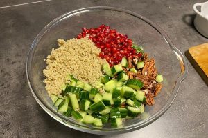 6. Snijd de komkommer in blokjes en haal de granaatappelpitjes eruit.