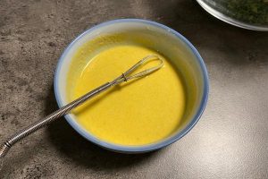 8. Maak de dressing door de mosterd, het citroensap, azijn, olijfolie en wat peper en zout te mixen in een kommetje.