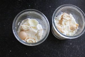 1. Klop de slagroom lobbig en voeg dan de mascarpone, suiker en 2 eetlepels geraspte kokos toe en klop dan geheel stijf. Neem 4 glaasjes en verdeel een beetje van het kokos roommengsel over de bodem.
