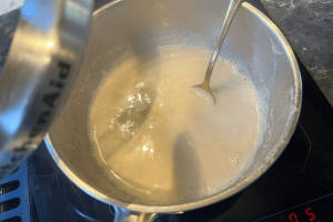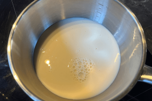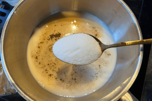 2. Breng de plantaardige melk aan de kook, voeg hier de suiker het merg van een half vanillestokje aan toe en een theelepel kaneel.