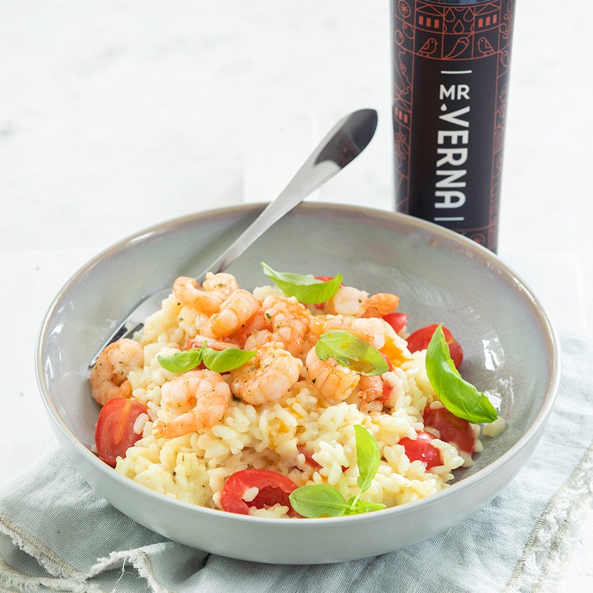Bestrooi de garnalen met een beetje paprikapoeder, peper en zout en bak in een pannetje 2 a 3 minuutjes. Schep de risotto op borden en schep hier de garnalen op. Garneer de risotto bij het opdienen met wat verse basilicum. Wil je het gerecht spicy maken besprenkel de risotto en garnalen met Mr. Verna Olio al Peperoncino, dit is heerlijke olijfolie met rode chilipeper en geeft het gerecht een extra kick.