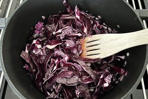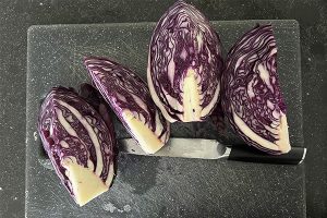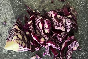 3. Snijd de rode kool in vieren, verwijder de harde kern en snijd de rest in dunne reepjes.