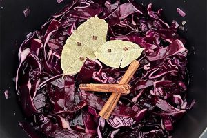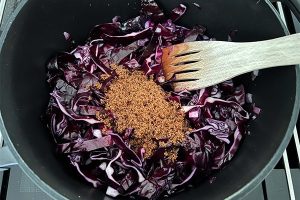 5. Voeg de rode kool toe en vervolgens ook de suiker, kaneel, appelazijn, peper, zout, water en de blaadjes laurier met kruidnagel.