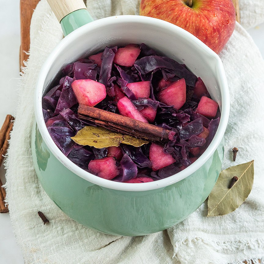 9. Serveer de rode kool met appel met bijvoorbeeld aardappelpuree en (vega) balletjes of hachee.