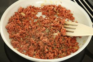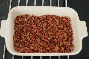6. Vet een ovenschaal in en verdeel op de bodem een laag met het gehakt.