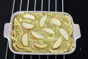 8. Dek deze af met een laag aardappelpuree. Verdeel de laatste plakjes appel over de bovenzijde.
