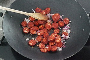 2. Bak de chorizo in een pan. Chorizo is vrij vet en bij verhitting komt er vet vrij. Zodra dit gebeurt, voeg je de ui toe.