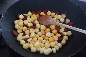 3. Voeg na een paar minuten de aardappeltjes toe en bak 15 minuten mee.