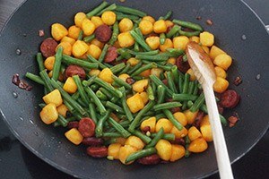 4. Voeg ook de sperziebonen toe en bak al scheppend nogmaals 15 minuten.