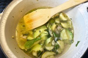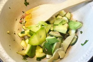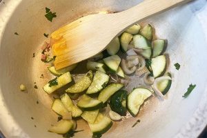2. Verhit de olijfolie in een soeppan en fruit de sjalot en knoflook voor 2 minuten aan. Vervolgens voeg je de courgette in stukken en de peterselie toe. Bak dit 10 minuten mee.
