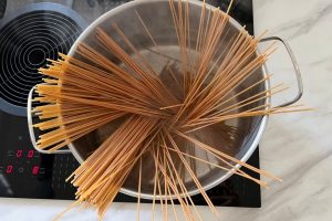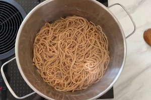 1. Kook de spaghetti volgens de aanwijzingen op de verpakking. Giet daarna af en voeg een scheutje olie toe zodat het niet blijft plakken. Zet opzij tot de saus klaar is.