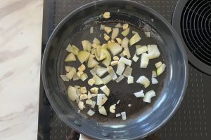 2. Verhit voor de saus een scheutje olijfolie in een koekenpan en fruit daarin de ui en knoflook 2-3 minuten op middelhoog vuur.