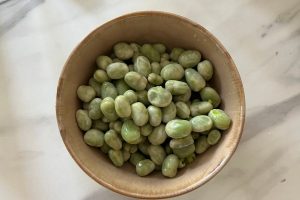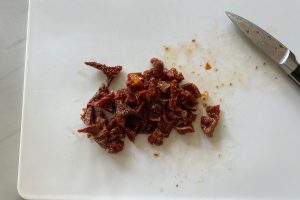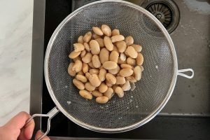 5. Haal de tuinbonen uit de diepvries en verwarm ze kort in wat kokend water tot ze beetgaar zijn. Hak in de tussentijd de zongedroogde tomaat fijn.