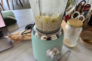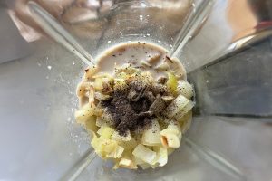 3. Doe de gebakken ui en knoflook in een blender. Spoel de bonen goed af en voeg toe.