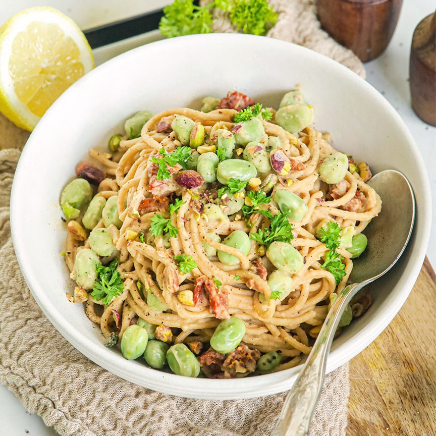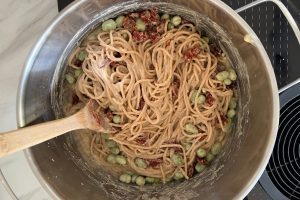 6. Giet de saus bij de spaghetti in de pan en voeg de tuinbonen en zongedroogde tomaat toe. Verwarm een paar minuten op middelhoog vuur. Breng op smaak met peper en zout.