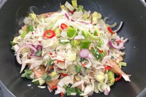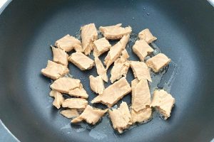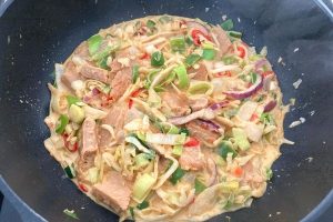 2. Bak ondertussen de (vega) kipstukjes in de pan goudbruin. Voeg zodra de kip gebakken is de Thaise groentemix toe en roerbak dit een paar minuutjes mee.