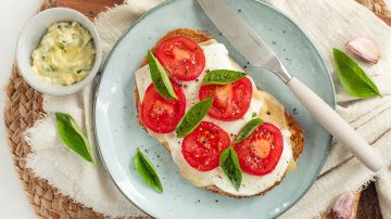 1. Snijd de tomaten en mozzarella in gelijke plakken. Leg ze om en om in een rondje op een bord. Stop er op een aantal plekken blaadjes basilicum tussen.